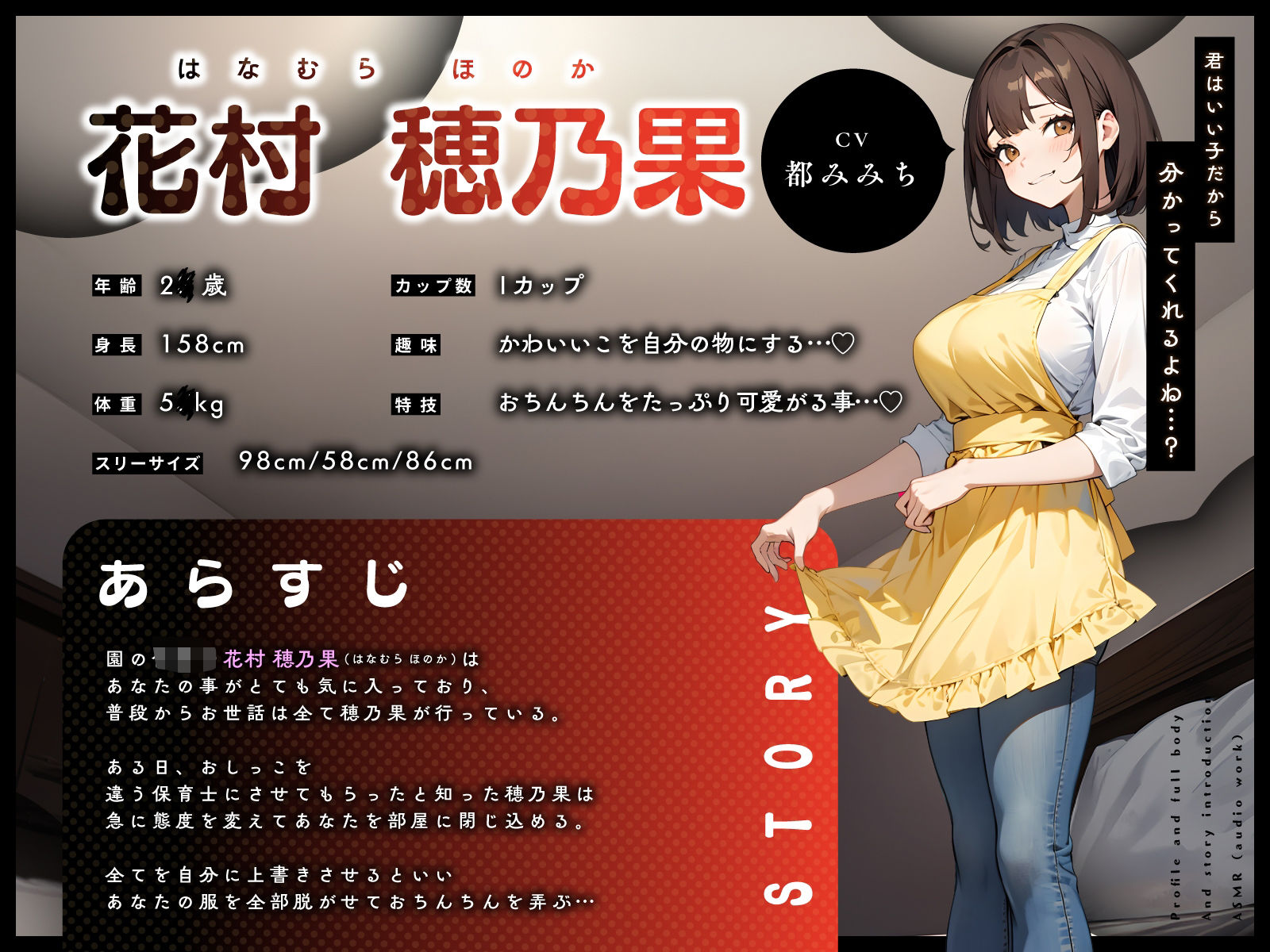 ジャンル: 巨乳、中出し、フェラ、パイズリ、おっぱい、ヤンデレ、男性向け、成人向け、耳舐め、男性受け、女性優位、耳ふー