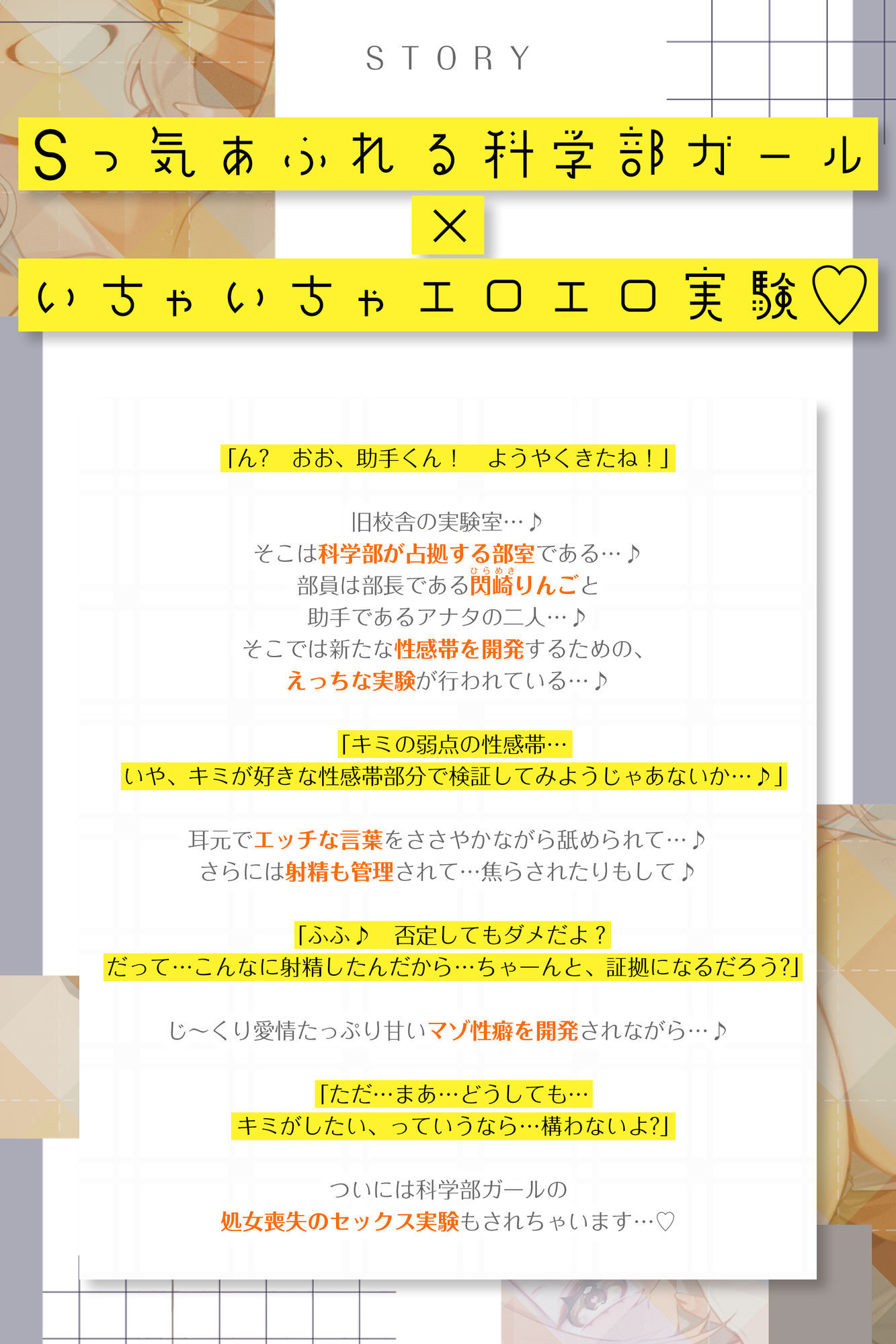 CV:陽向葵ゅか様演じる、Sっ気あふれる科学部ガールとのいちゃいちゃエロエロ実験をたっぷりお楽しみください…♪♪