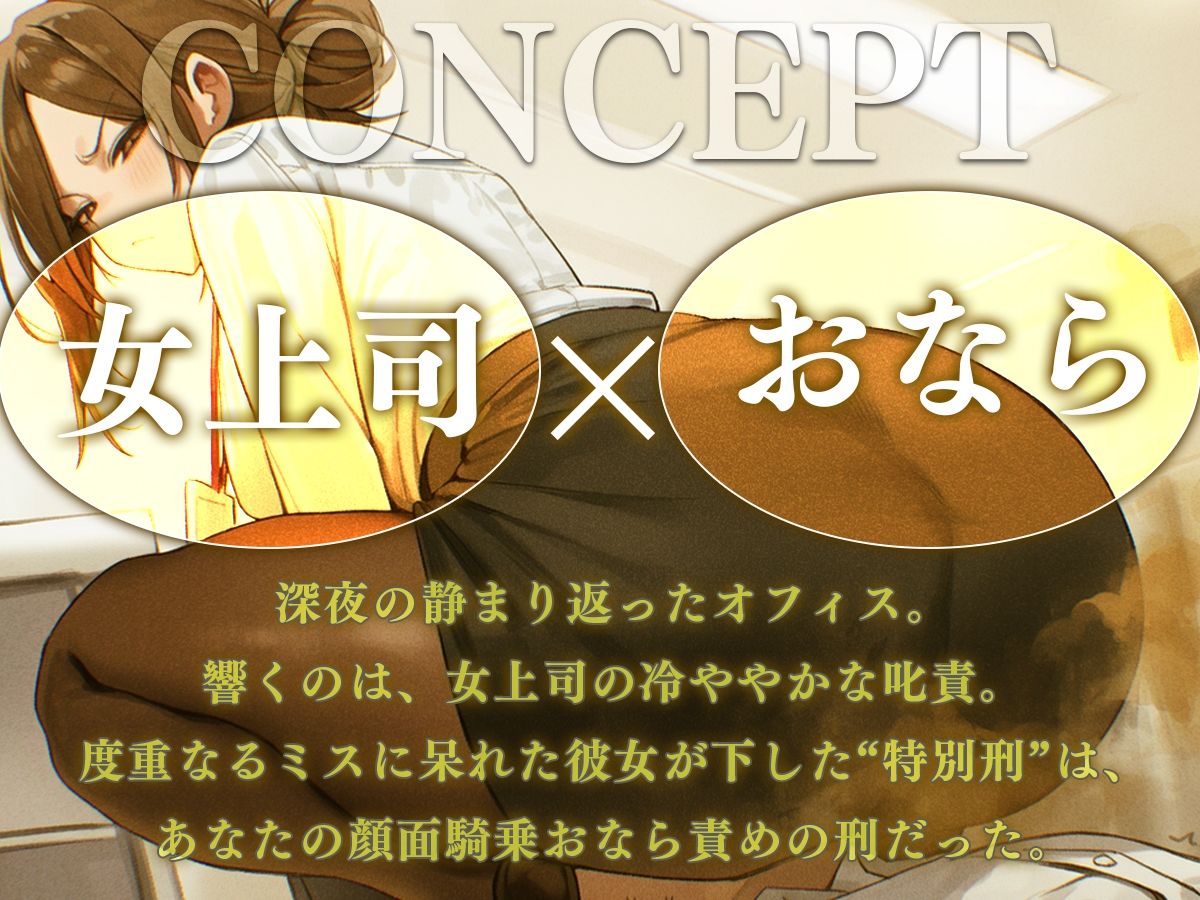 深夜の静まり返ったオフィス。響くのは、女上司の冷ややかな叱責。 度重なるミスに呆れた彼女が下した‘特別刑’は、あなたの顔面を椅子代わりにする「顔面騎乗おなら」だった。